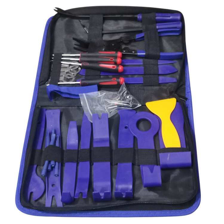 کیت ۳۷ تکه حرفهای برای باز کردن و جداسازی قطعات داخلی خودرو بدون خط و خش. شامل انواع اهرم پلاستیکی، ابزار جداساز کلیپ، اسپاتول و ابزارهای مخصوص برای برداشتن رودریها، پنلها، قاب رادیو و تریمها — مناسب تعمیرکاران، نصابهای سیستم صوتی و علاقهمندان DIY.